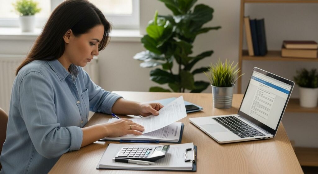 Une personne seule, assise à sa table de cuisine modeste, face à un ordinateur portable affichant le site de la CAF, un dossier de papiers administratifs étalé à côté, dans un appartement sobre et lumineux.